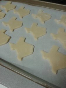 To keep the edges looking nice and crisp, freeze your cut cookies just before sending them to the oven. That way they will end up looking like Texas, not “a cloud that looks like Texas.”