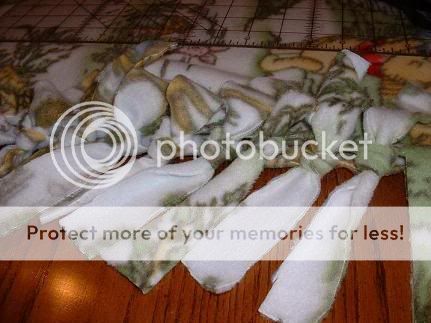 -Make a human sized blanket: Decide you large a blanket you want to make. Take these dimensions, and add 10" to the width and 10" to the length (for the 5" strips on each side). Remember, most fleeces come in 52" widths, so this would give you a blanket 42" wide. Follow the instructions above, just with a lot more cutting and tying!